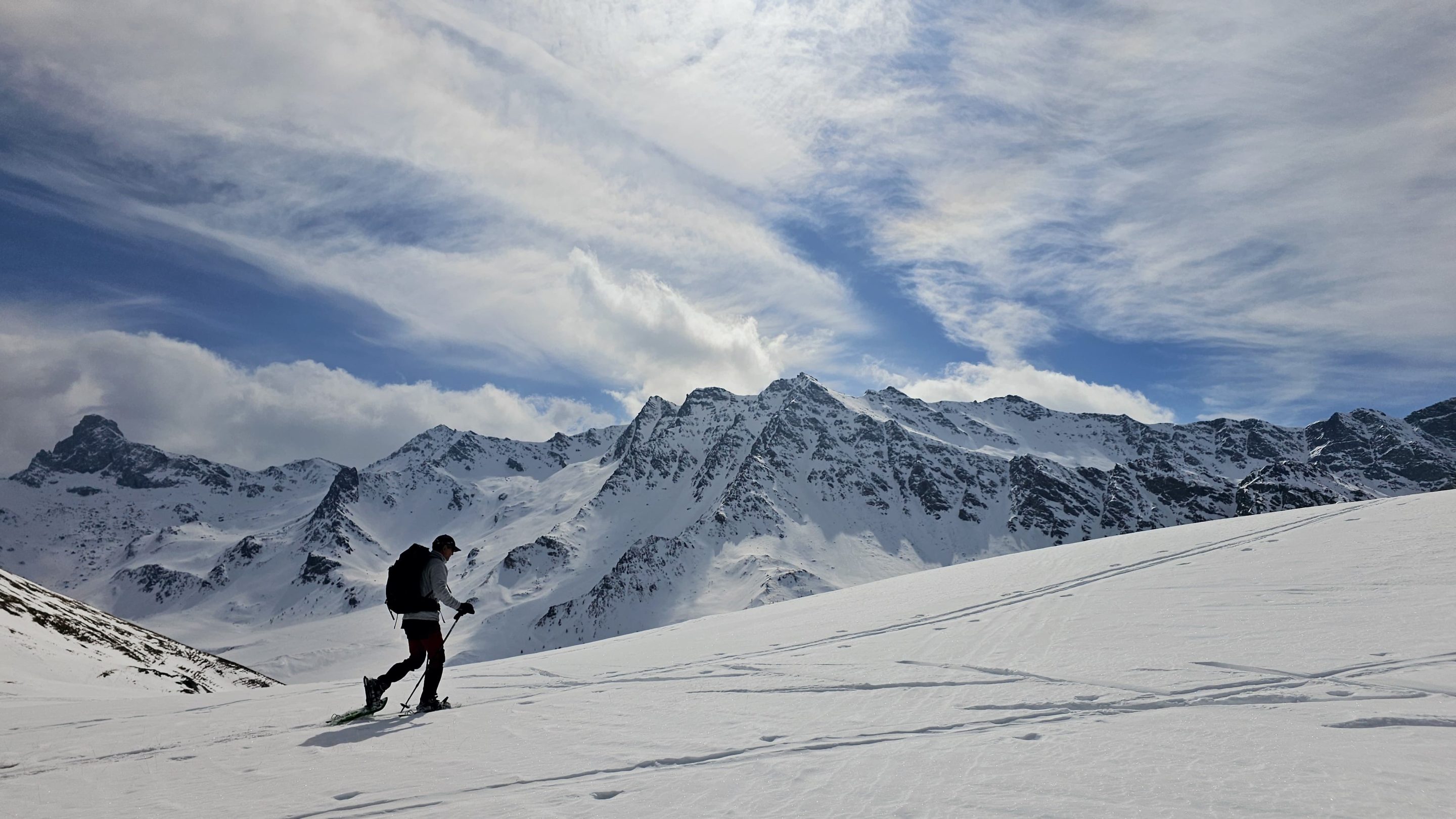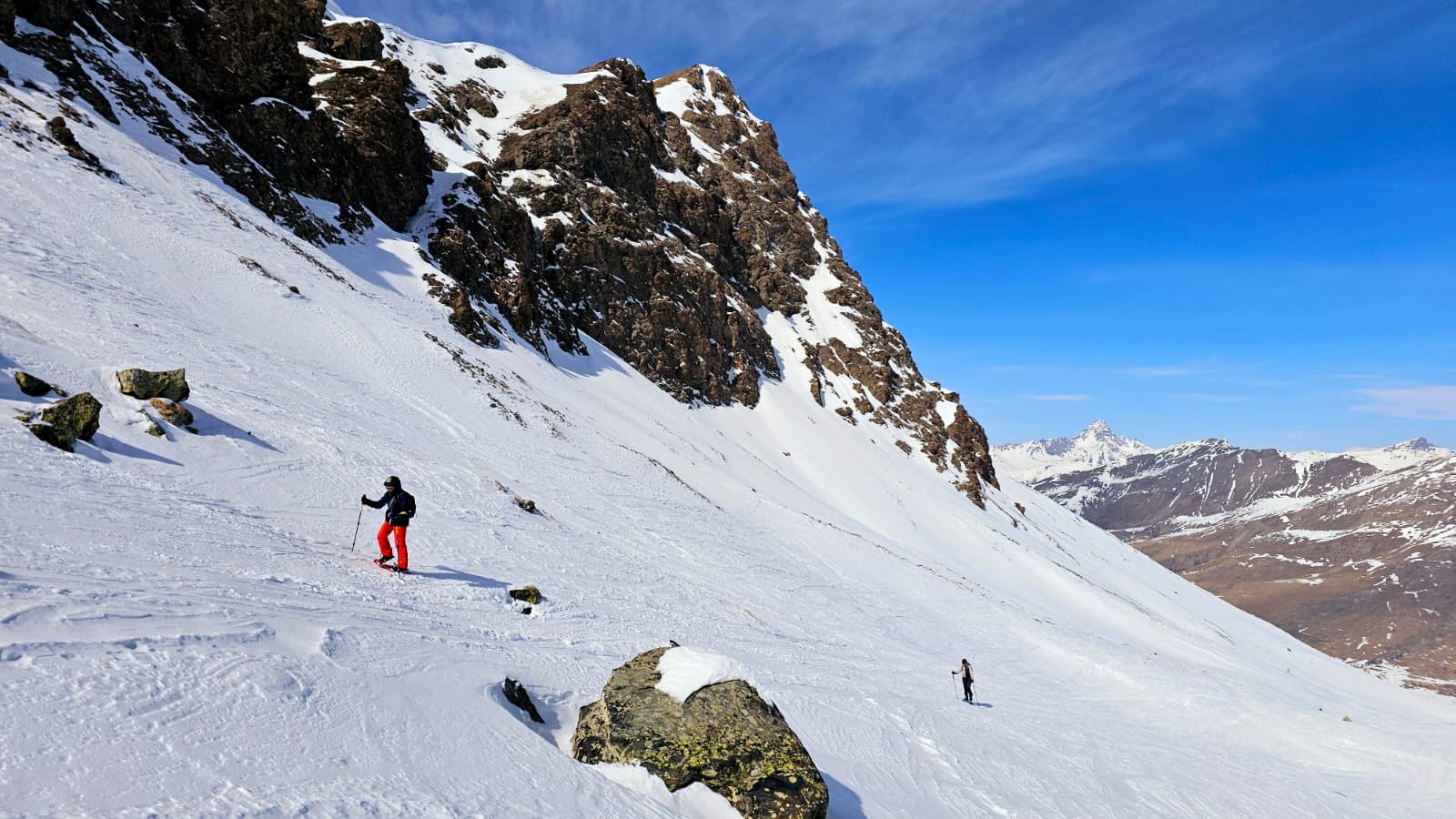 De Montbardon, nous remontons des secteurs très peu fréquentés en hiver. Ces grands espaces forestiers rappellent le Canada. Autour de nous des montagnes imposantes ajoutent à l’impression de grandeur. Au pied du col Fromage, la pente se redresse et nous finissons par déboucher sur un très beau panorama sur le massif de la Font Sancte et le nord du Queyras. Nous descendons ensuite dans la vallée du Cristillan vers Ceillac, point d’arrivée de notre traversée.